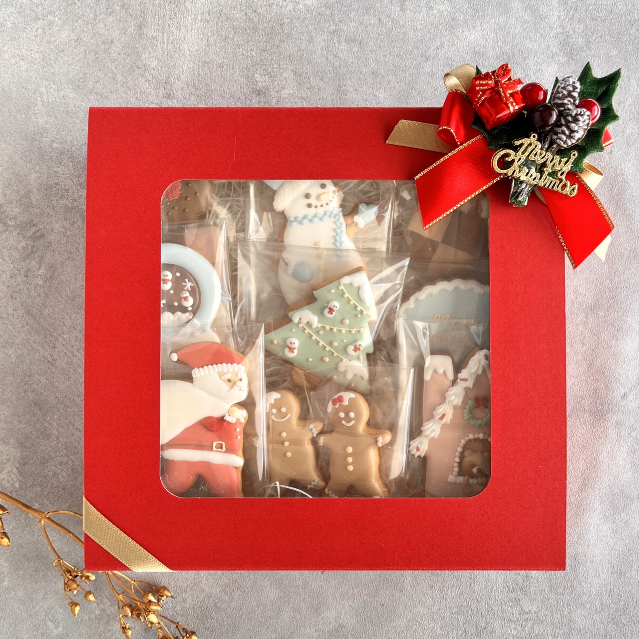 赤い窓付きの専用BOXに詰め合わせ、クリスマスらしい華やかなラッピングに仕上げました。