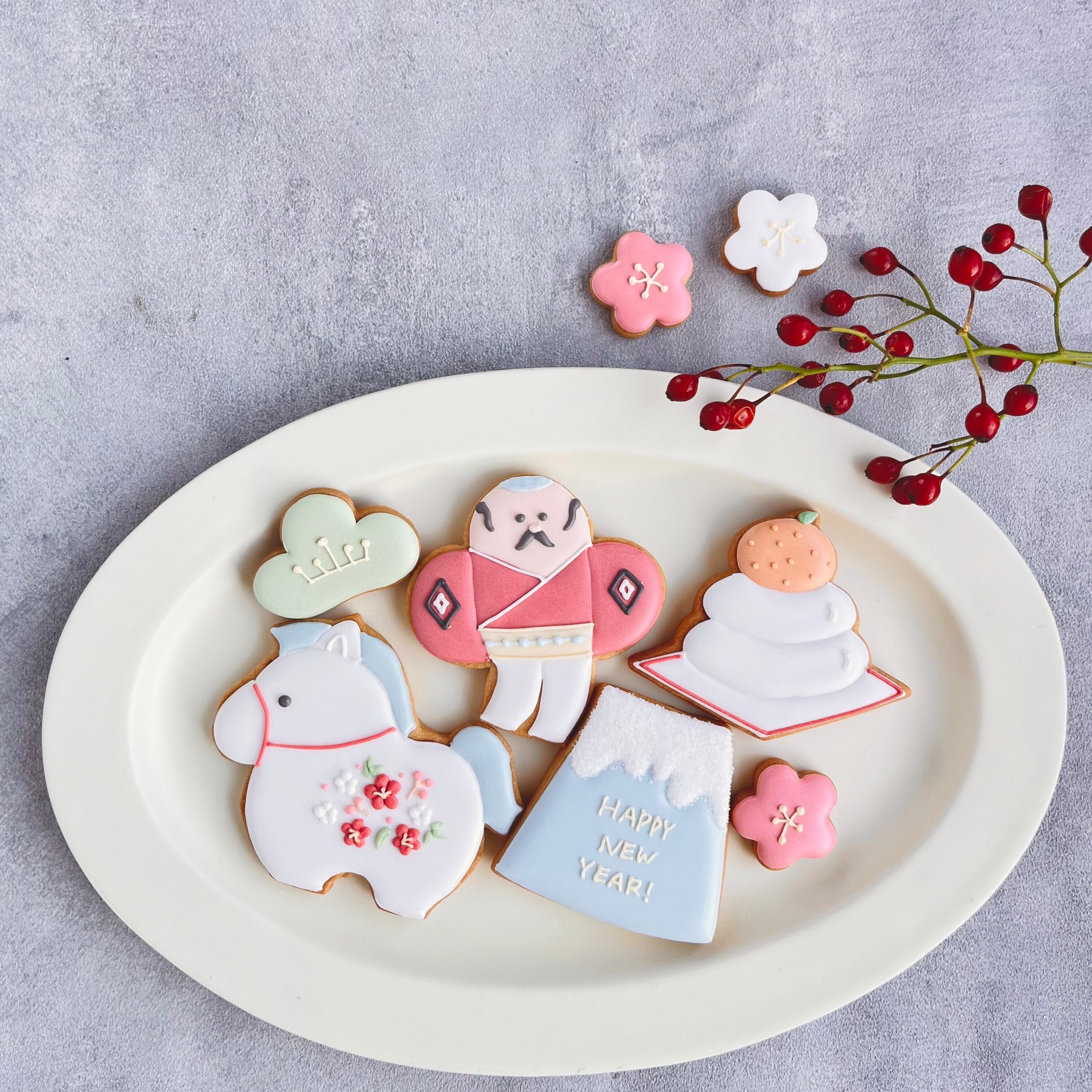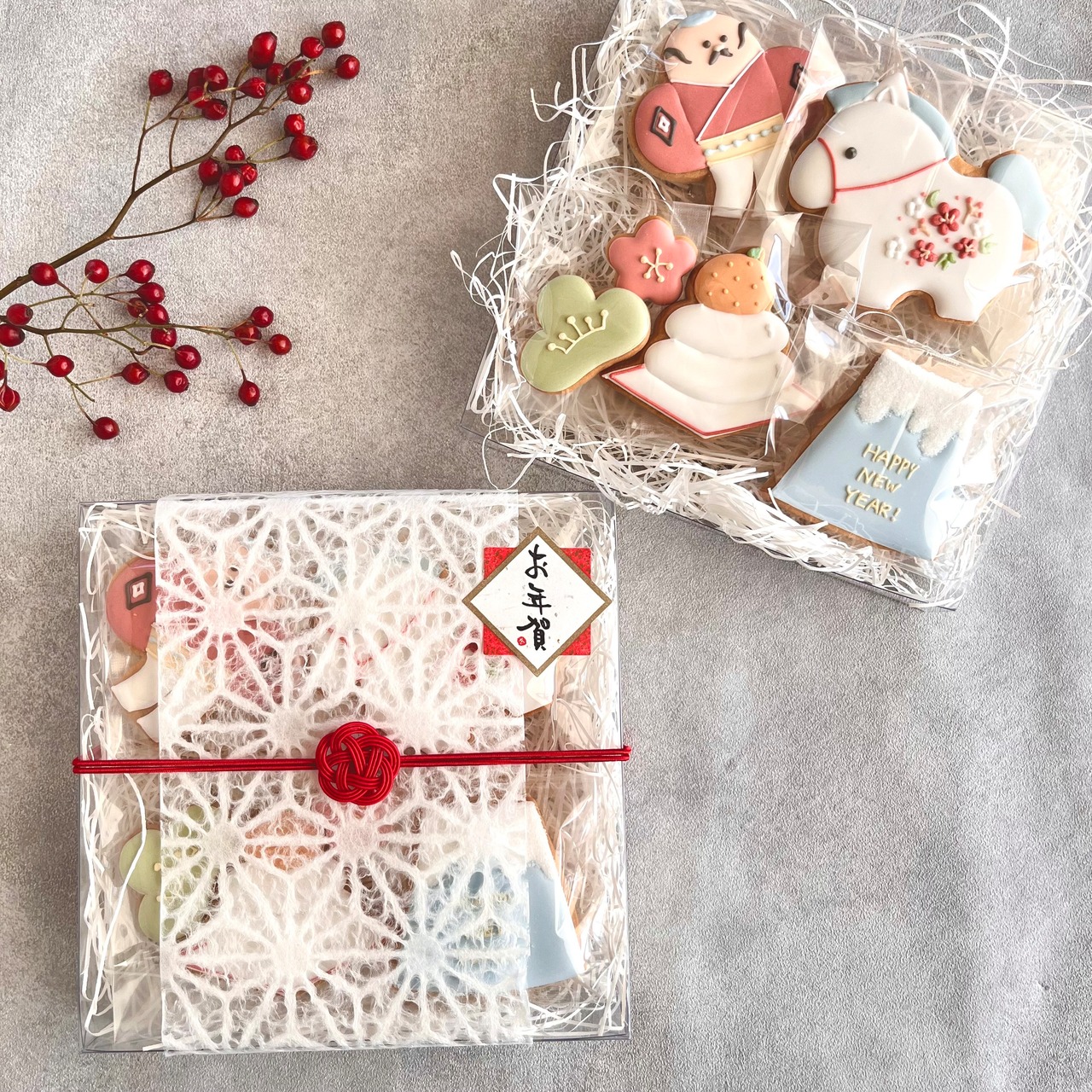 今年の干支《午》のほか、凧揚げ・鏡餅など、縁起の良いモチーフを可愛らしくデザインしたアイシングクッキーを詰め合わせました。